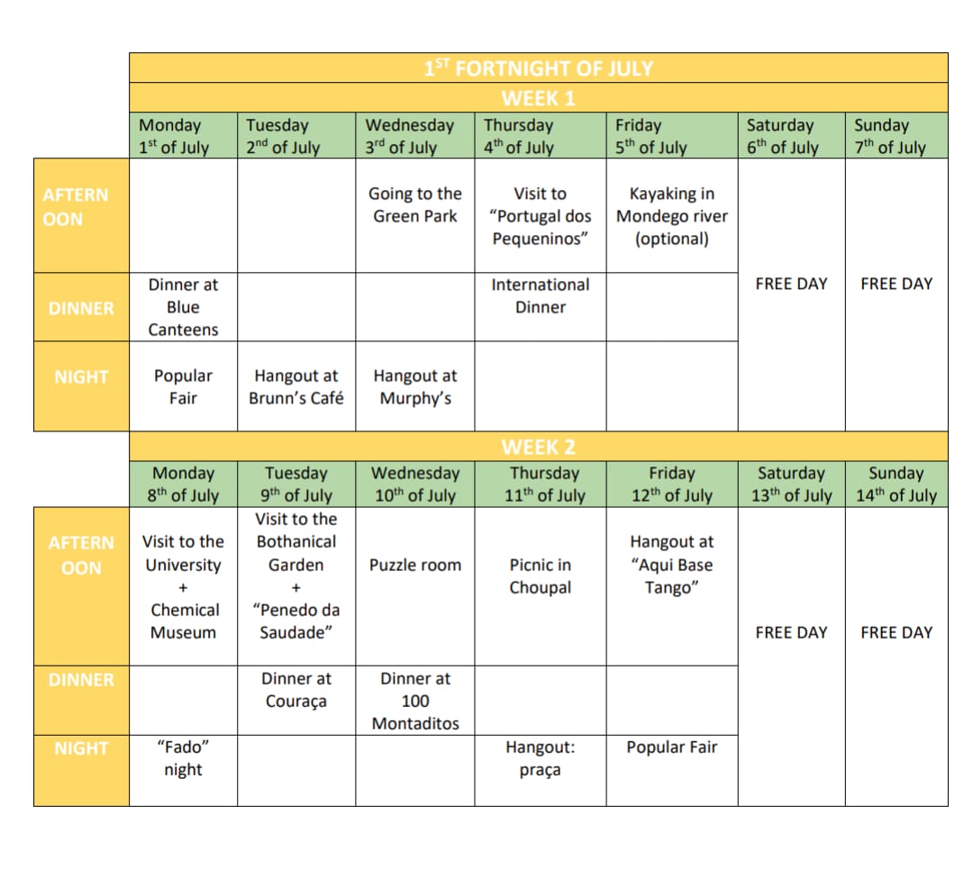 그 이후에는 짜여진 SEP프로그램에 참여했다. SEP 학생들과 함께 저녁을 먹기도하고, 놀이공원에 가기도 하고, 새벽 늦게까지 술을 마시기도 했다. 이곳의 카페는 주로 새벽 3~4시가 돼서야 문을 닫았기에, 우리는 거의 매일 새벽까지 함께 놀았다. International dinner 프로그램에서는 각자 본인나라의 음식을 제공하여 함께 먹었다. 다양한 국가의 음식을 먹을 수 있어 의미 있는 시간이었다. 또한 공원 잔디밭에 앉아 크게 노래를 틀고 마피아 게임을 하던 것이 기억에 남는다. 금요일 실습이 끝나고는 포르투갈의 다른 지역으로 카야킹을 타러 가기도 했다. 거기서 처음 달팽이를 먹어보았는데, 생각보다 맛이 좋았다.