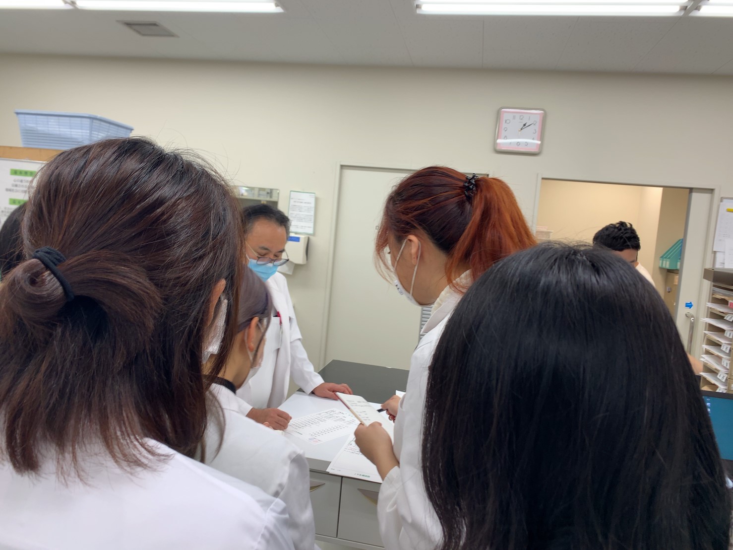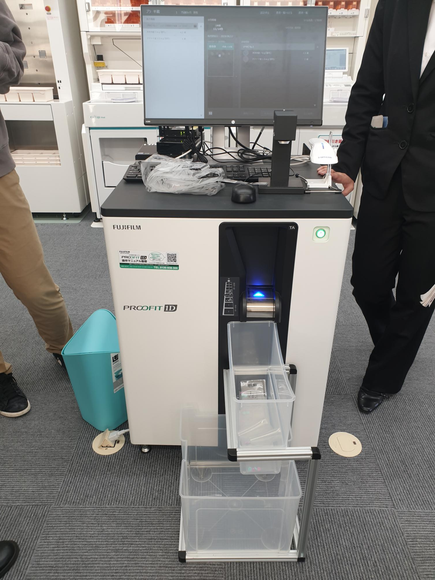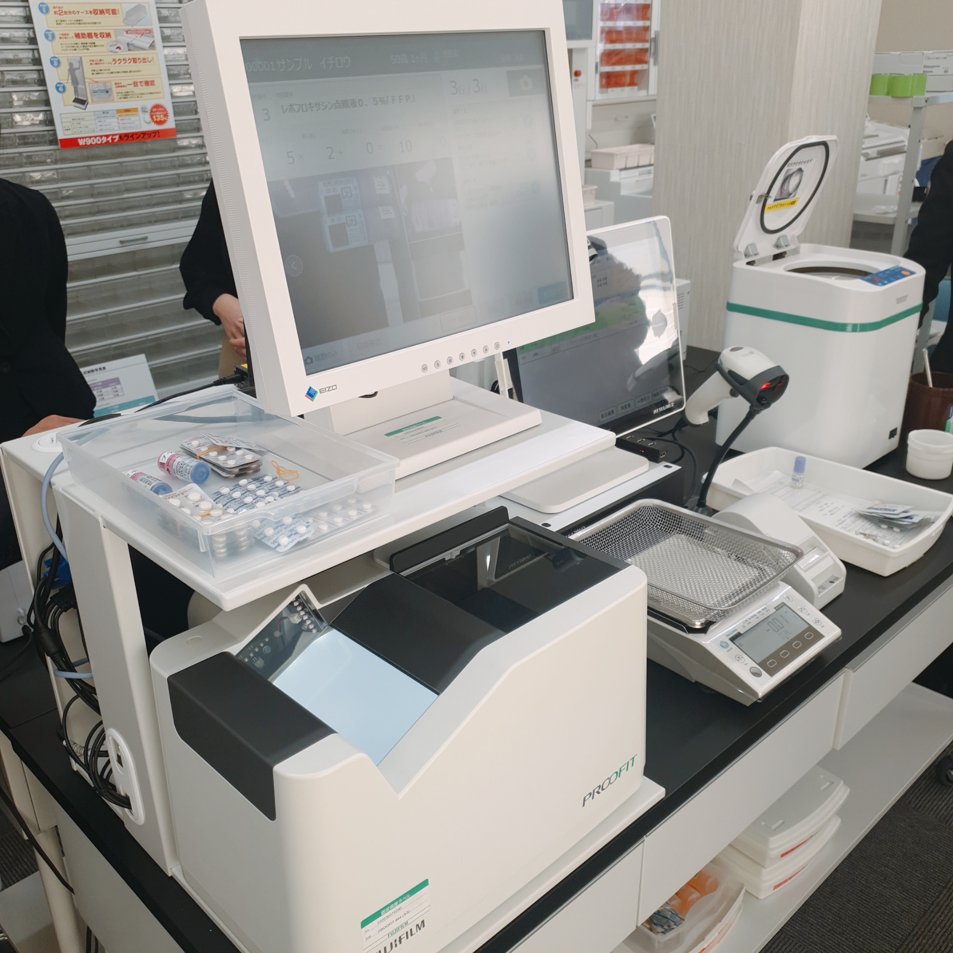 Drugstore 내에 처방전 조제실, 한방(かんぽう; 칸포)전용 약제실, 영양상담실, 운동상담실 등이 갖춰져 있었습니다. Drugstore 내의 조제실도 지역약국 약제실과 비슷한 수준으로 거의 모든 과정이 자동화 되어있었습니다. 처방전을 접수하면서 체질, 알레르기, 음주/흡연여부 등에 관한 앙케이트를 작성하고 보험카드와 약수첩(お薬の手帳)을 같이 제출합니다. 2019년 4월 이후로 일본에서는 조제보조원이 약을 취급하는 것이 가능해졌다고 합니다. 조제보조원이 포장한 약은 약사가 확인하고 약에 붙은 바코드로 이중 확인을 합니다. 조제보조원의 직무는 나라마다 차이가 있다고 합니다. 일본의 경우, 조제보조원이 가루약이나 시럽은 취급할 수 없으며 미국의 경우에는 별도의 면허를 가지고 항암제를 섞는 것도 가능하다고 합니다.