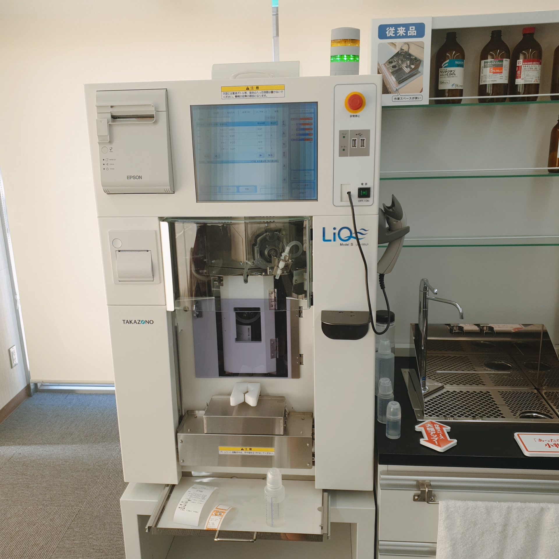환자가 처방전을 가져오면 이전 조제이력과 처방전을 같이 관리합니다. 해당 체인약국은 휴대용 단말기를 보유하고 있는데 약통의 바코드와 처방전의 바코드를 각각 찍어서 맞는 약을 쓰는지 1차적으로 확인합니다. 이렇게 입력된 처방전 바코드를 통해 각각 가루약, 시럽 등을 제조하는 기계로 데이터가 자동으로 전송됩니다. 시럽을 만들어주는 기계의 경우, 밑에 플라스크를 고정시켜주기만 하면 처방된 시럽의 비율까지 기계가 알아서 섞어줍니다. 연고제를 섞을 때에는 고속회전장치를 이용하는 등 조제 과정 대부분이 자동화 되어있었습니다. 한국과 달리 일본은 약사와 한약사의 구분이 없기 때문에 양약과 한약을 동시에 처방할 수 있고 한약(かんぽう; 칸포)에는 다양한 약재가 증상에 따라 하나의 팩에 포장되어 있습니다. 조제가 모두 완료되면, 서로 다른 약사가 최소 2번 이상 처방전과 처방된 약을 다시 한번 확인합니다. 즉 환자에게 약이 전달되기 전까지 최소 3번의 확인 과정을 거칩니다.