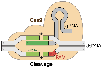 3세대 유전자 가위는 특정 유전체를 인식하는 반복서열인 CRISPR 영역에서 전사된 gRNA(guide RNA)와 가위역할을 하는 Cas9 단백질로 구성된다. 이때 gRNA는 5‘-NGG-3’로 이루어진 PAM(protospacer-adjacent motif)서열을 포함하는 상보적 서열을 갖는 DNA에 결합함으로써 Cas9이 선택적으로 유전자 부위를 자를 수 있도록 해준다. Cas9 단백질을 미리 합성해놓고 공통으로 사용가능하며, gRNA의 염기서열만 바꿔주면 다양한 원하는 유전자 부위를 자를 수 있기 때문에 이전 기술들보다 보다 간편하고 다양한 유전자에 확장 적용이 가능하다는 장점을 갖는다.
