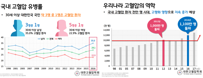 2020년 5월 건강보험심사평가원이 발표한 자료에 따르면 2018년 기준 고혈압 유병률 및 요양 급여비용은 지속적으로 증가하고 있습니다. 만 30세 이상에서 수축기 혈압이 140mmHg 이상이거나 이완기 혈압이 90mmHg 이상, 또는 고혈압 약물을 복용한 분율인 고혈압의 유병률은 28.3%로 높은 비율을 차지하고 있습니다. 고혈압 외래 진료 환자 수는 약 850만 명으로 우리나라 30세 이상 인구의 약 1/4에 해당함으로써 고혈압의 국내 유병률이 상당히 높음을 알 수 있습니다. 또한 30세 이상 대한민국 국민의 약 3명 중 1명은 고혈압 환자입니다. 30세 이상 남성의 경우 35%, 여성의 경우 23%로 여성보다 남성에서 고혈압을 기저질환으로 갖는 비율이 높았습니다.