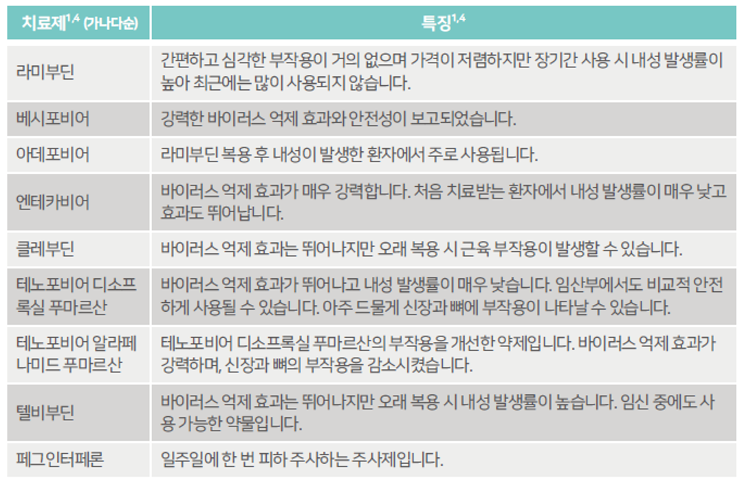 B형 간염 치료제에는 라미부딘(Lamivudine), 베시포비어(Besifovir), 아데포비어(Adefovir), 엔테카비어(Entecavir), 클레부딘(Clevudine) 등이 있습니다. 이는 바이러스를 효과적으로 억제하여 간염의 진행을 막고 합병증의 위험을 낮출 수 있지만, 바이러스를 제거하지는 못합니다. B형 간염 치료제로 B형 간염이 완치되는 경우는 극히 일부이며 대부분의 환자는 평생 치료제를 복용해야 합니다.