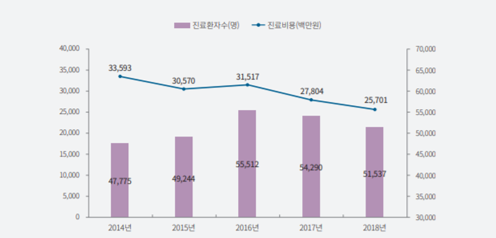 국내에서는 B형 간염 바이러스가 만성 간질환의 가장 흔한 원인입니다. 2019년 건강보험심사평가원의 최근 5년간 B형 간염, C형 간염 진료 경향 분석에 따르면 국내 B형 간염 환자는 증가 추세에 있으며 2018년 B형 간염 환자 수는 약 38만6천 명으로 2014년 대비 15.1%가 증가했습니다. B형 간염 진료 비용 또한 지속해서 증가하여 2018년 B형 간염의 진료 비용은 약 1,447억 원, 1인당 진료 비용은 약 37만5천 원으로 나타났습니다. C형 간염은 2014년부터 2018년까지 환자 수가 감소했으며 2018년 C형 간염 환자 수는 약 5만1천 명으로 2014년 대비 48.6%가 감소했습니다. 2018년 기준 C형 간염 진료 비용은 약 257억 원, 1인당 진료 비용은 약 49만8천 원으로 나타났습니다.