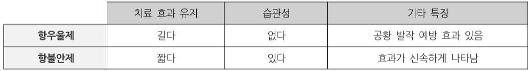 공황 장애와 불안장애에 사용되는 약물에는 항우울제와 항불안제가 있습니다. 각각의 특징은 다음과 같으며, 항불안제의 경우 습관성이 있어 정신과 전문의의 관리하에 약물을 복용해야 합니다.