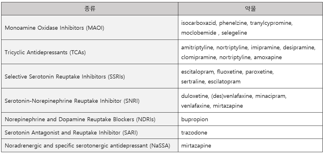 우울증 약물은 우울증을 초래한 신경전달물질(세로토닌, 노르아드레날린, 도파민 등)의 이상을 정상화시켜 우울증의 회복을 돕습니다. 신경전달물질이 다양한 만큼 약물이 작용할 수 있는 기전도 다양하여 항우울제에는 많은 종류가 존재합니다. 대표적인 항우울제 종류로는 Monoamine Oxidase Inhibitors (MAOI), Tricyclic Antidepressants (TCAs), Selective Serotonin Reuptake Inhibitors (SSRIs), Norepinephrine and Dopamine Reuptake Blockers (NDRIs), Serotonin-Norepinephrine Reuptake Inhibitor (SNRI) 등이 있습니다.