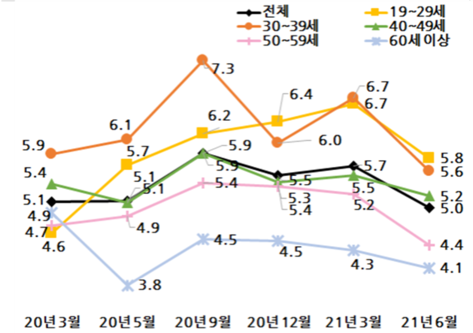 올해 7월 보건복지부에서 발표한 2021년 2분기 코로나19 국민 정신건강 실태조사 결과에 따르면, 우울, 자살 생각 등 정신건강 지표는 다소 개선되었으나 여전히 발병 전보다는 높은 수준으로 나타났으며, 특히 젊은 층에서 높았습니다.