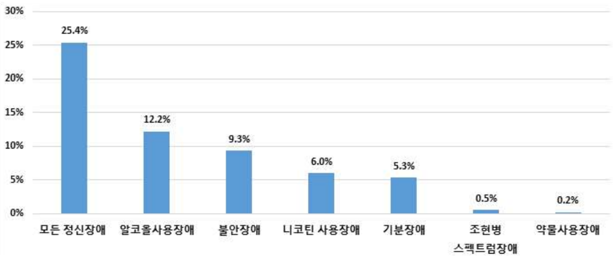 개별 주요 정신 질환군의 평생 유병률은 알코올 사용장애, 불안장애, 니코틴 사용 장애, 기분 장애(주요 우울장애 5.0%), 조현병 스펙트럼 장애, 약물 사용 장애 순으로 높습니다. 성별로 살펴보면 남성에서는 알코올 사용 장애가, 여성에서는 불안 장애의 평생 유병률이 가장 높았습니다.