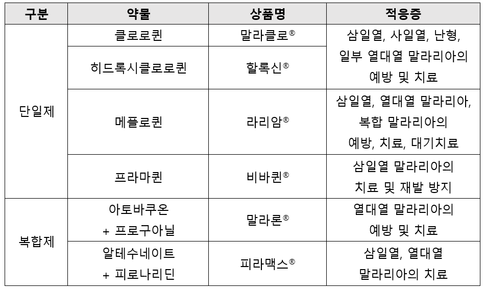 국내 시판 중인 항말라리아제와 그 적응증 에 대해 아래 표에 정리하였으며, 말라리아 치료제는 예상되는 원충의 약에 대한 내성을 감안하여 선택되어야 합니다.