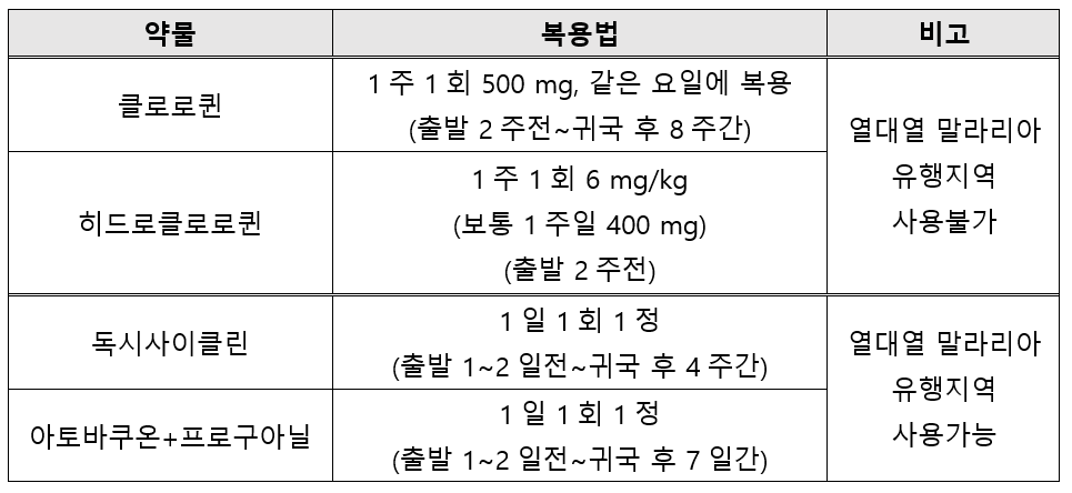동남아시아, 중동, 중부아프리카, 중남미 등 말라리아 위험 지역을 여행할 때에는 항말라리아제를 복용하는 것이 권장됩니다. 성인의 말라리아 예방요법에 사용되는 약물과 복용법을 아래 표에 정리하였습니다.