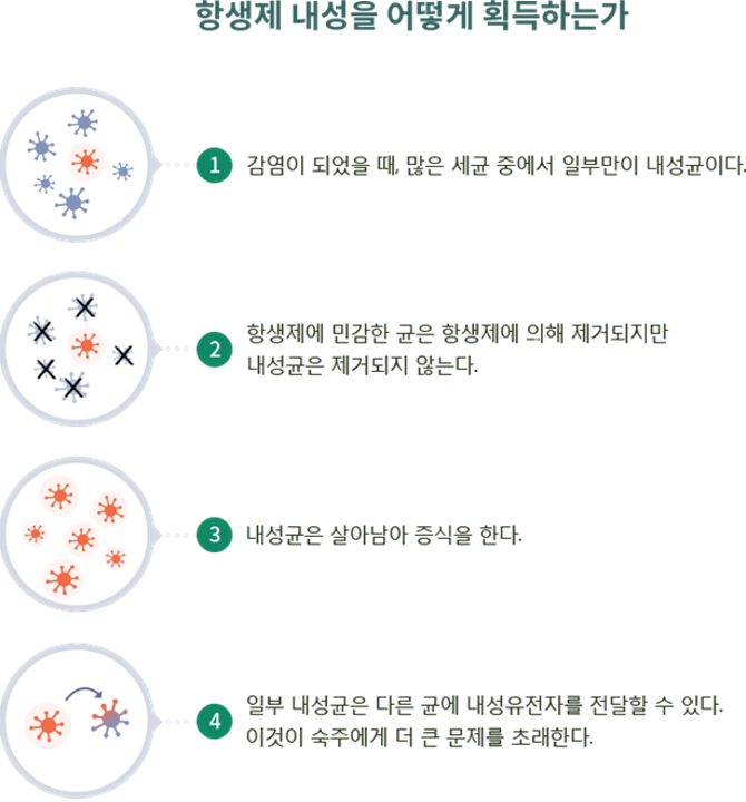 항생제 내성은 미생물이 항생제에 노출되어도 항생제에 저항하여 생존할 수 있는 약물 저항성을 의미합니다. 이는 항생제의 공격에 살아남기 위한 세균의 생존 전략이라고 볼 수 있으며 일부 내성유전자는 수평적 전달이 가능하여 다른 균으로 이동하여 내성을 전파시키기도 합니다. 어떤 이유로든 항생제를 복용할 경우 항생제에 민감한 균들은 죽게 되고 내성을 보이는 일부 균들이 살아남아 선택적 압력에 의한 증식을 하게 됩니다. 따라서 항생제의 사용은 내성균을 초래할 수밖에 없어, 항생제는 반드시 필요한 경우에 적절한 요법으로 사용해야 합니다.