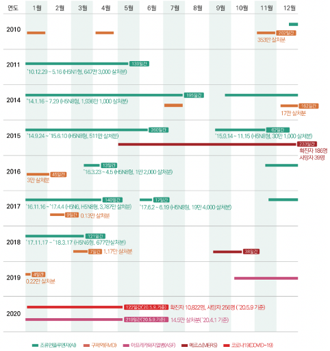 구제역 | 2000년 | - 우제류(발굽이 둘로 갈라진 동물)가 감염되는 질병, 공기 전파 가능 - 중국 등에서 입국하는 여행객의 불법축산물 등으로 유입 위험성 지속 |