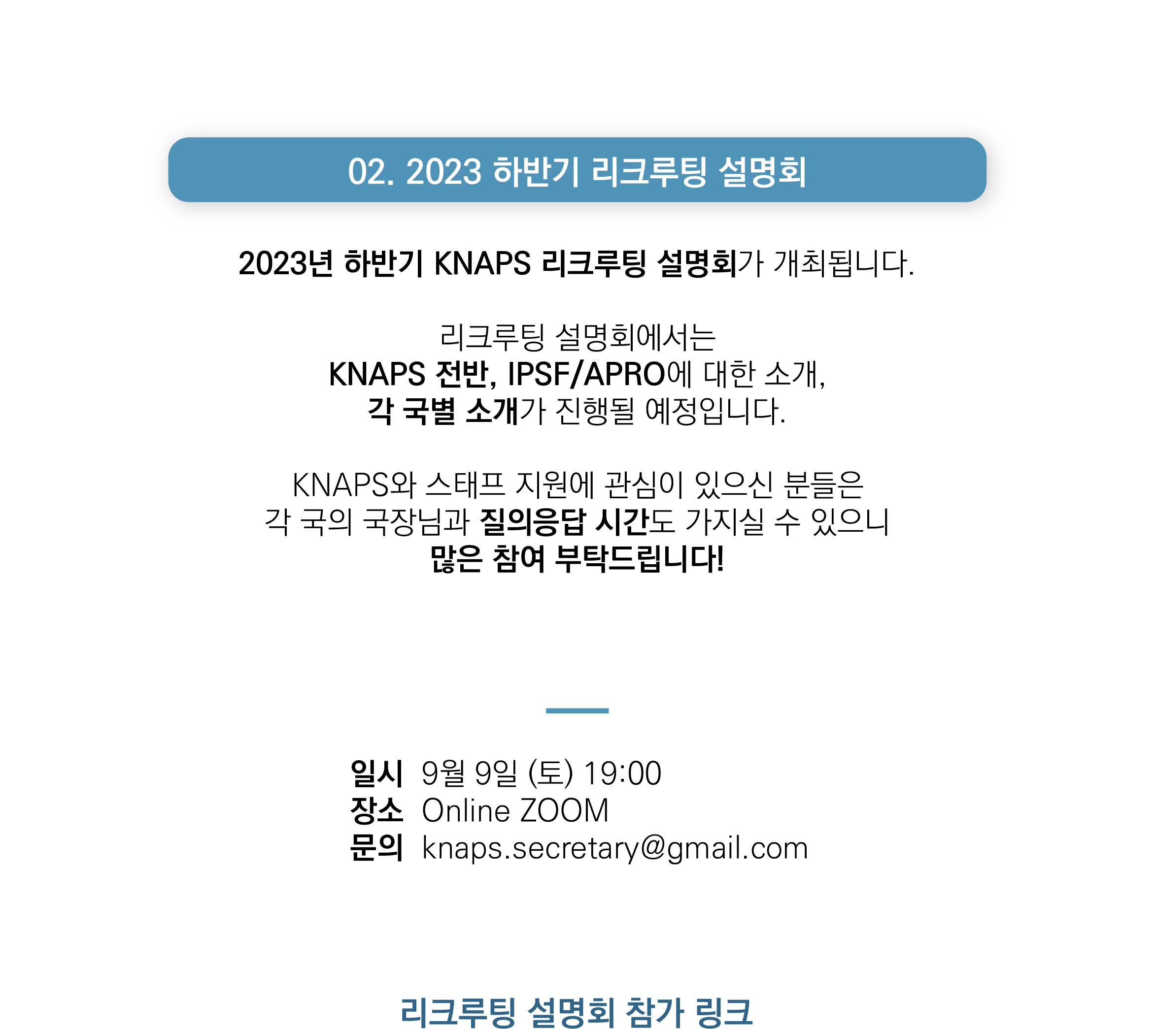 KNAPS 2023 상반기 정기회의(Regular Assembly) (1) | 2023.04.29 |