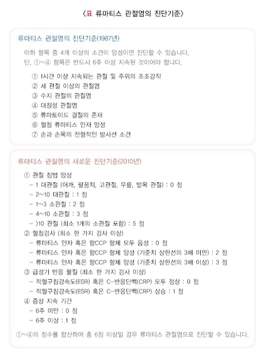 한 개 이상의 관절에서 다른 질환이 원인이 아닌 것으로 추정되는 분명한 활막염(관절종창) 증상을 보이는 경우 다음 4가지의 분류 기준을 적용합니다. ㉠ 관절 침범 양상 ㉡ RF(류마티스인자), 항 CCP 항체 검사 중 최소 한 가지 이상의 혈청검사 결과 ㉢ 혈액검사 상의 급성 반응기 물질인 적혈구 침강 속도(Erythrocyte Sedimentation Rate, ESR)와 C-반응 단백(C Reactive Protein, CRP) ㉣ 6주 이상의 증상 지속 기간을 종합적으로 고려해 6점 이상인 경우 류마티스 관절염으로 진단합니다.