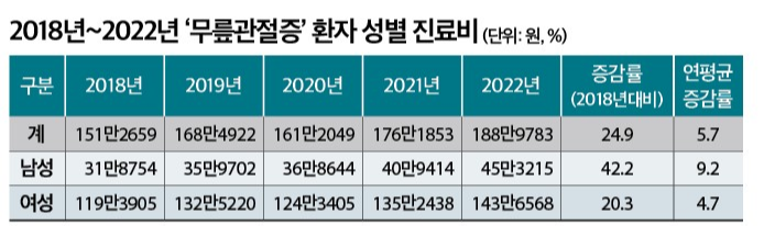 국내의 상황도 이와 비슷하게 매년 관절염 환자수가 증가하고 있습니다. 퇴행성 관절염 환자수는 지난해 300만 명을 넘어섰고, 관련 진료비도 2조 원에 육박한 것으로 집계되었습니다. 국민건강보험공단이 발표한 '2018∼2022년 무릎관절증 환자 진료인원' 현황에 따르면 지난해 기준 무릎관절증으로 병원 진료를 받은 환자는 306만 5,603명입니다. 이는 1년 전인 290만 6,058명보다 15만 9,545명(6.7%) 늘어난 규모입니다.