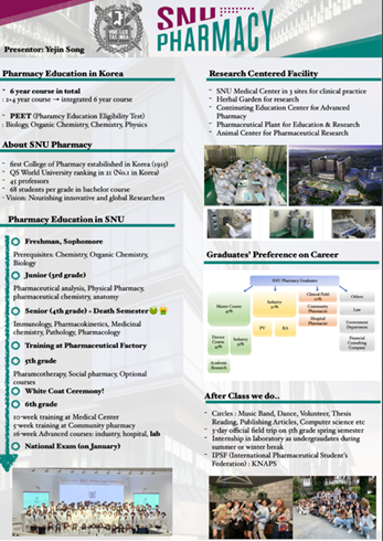 총 3번의 presentation을 하였는데, 첫번째는 ILLPE 발표로 각 대학의 학생들이 본인 국가의 약학 전공 시스템, 대학 생활, 약사의 진로 방향 등에 대해 포스터를 만들고 소개하는 시간을 가졌습니다. 다양한 국가의 약사 입지와 대학 생활에 대해 알아볼 수 있어 뜻깊었습니다.