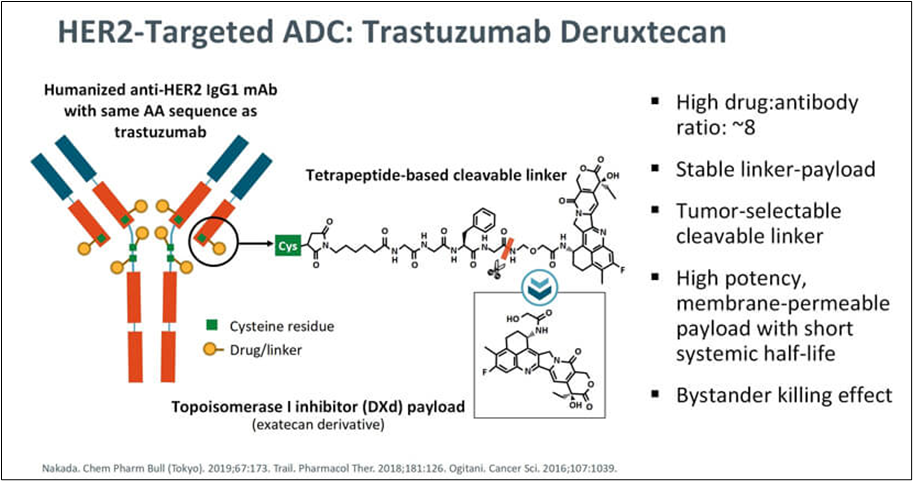 ENHERTU (trastuzumab deruxtecan) is an antibody-drug conjugate (ADC) medication. ADCs are drugs that combine an antibody, which binds to specific target antigens on the surface of cancer cells, with a low molecular weight drug (payload) through a linker. This structure leverages the antibody's specificity for the target and the potent cytotoxic activity of the drug to selectively act on cancer cells, enhancing treatment effectiveness and minimizing side effects. ADCs are considered one of the next-generation cancer therapies.
