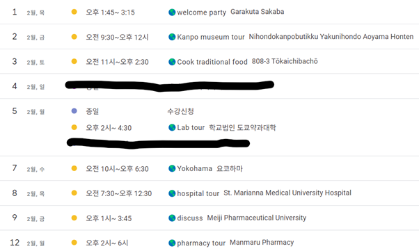 일본에서의 일정은 이러했습니다! 연구실(일본 약학대학 견학), 병원, 지역약국, 캄포 박물관 이렇게 주요 일정을 메인으로 휴일과 투어 일정이 주어집니다. 전반적으로 널널한 일정이었기 때문에 약 2주간의 도쿄 자유여행을 계획하셔도 충분합니다.
