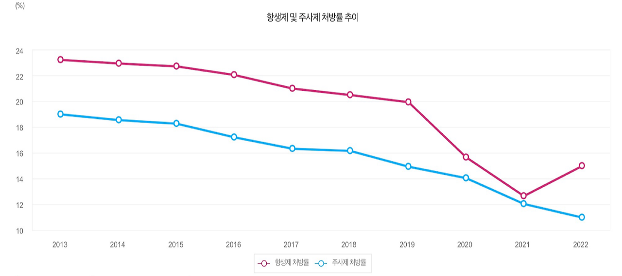 국내 항생제 처방률은 22.76%(2015년)에서 15.95%(2020년)로, 주사제 처방률은 18.28%(2015년)에서 13.95%(2020년)로 국내 의료기관의 항생제 및 주사제 처방률은 감소 추세에 있습니다.