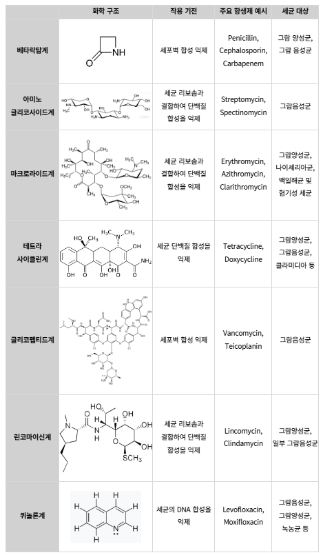 항생제는 “미생물에 의하여 만들어진 물질로서, 다른 미생물의 성장이나 생명을 막는 물질”을 말합니다. 항생제는 화학 구조와 작용 기전에 따라서 총 7가지로 분류할 수 있습니다.