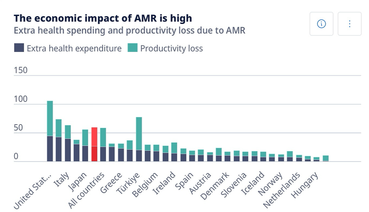 2023년 OECD 통계자료에 따르면, OECD 및 EU/EEA 소속 34개국에서 항생제 저항성에 의한 의료비 지출 및 생산성 감소를 함께 고려한 경제적 비용이 매년 660억 PPP(purchasing power parity, 구매력 평가지수-국가 간의 물가 수준을 고려한 실제 구매력)에 이른다고 밝혔습니다. 그 중에서 국내의 항생제 내성에 따른 경제비용은 약 25조(188억 달러)에 달합니다.