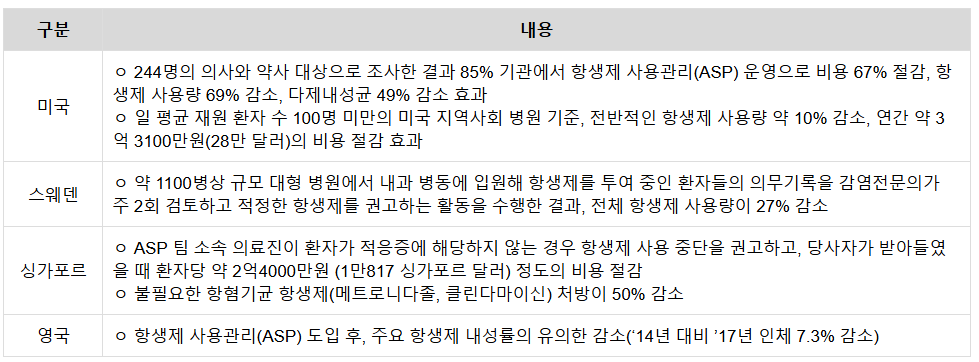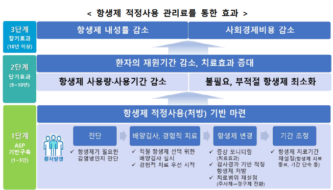 정부는 항생제 오남용으로 인한 내성균 발생을 줄이고자 의료기관 내에서 항생제 적정 사용 관리(ASP, Antimicrobial Stewardship Program) 를 시행하는 '항생제 적정 사용 관리료 시범사업'을 추진하고 있습니다.