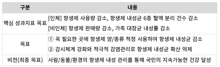 2015년 세계보건기구(WHO)는 항생제 내성으로 인한 글로벌 보건 위기를 경고하며 국제적인 행동계획을 제시하고, 국가별 대책 마련을 강력히 촉구했습니다. 이에 대한민국은 항생제 내성 문제에 대응하기 위하여 질병관리청을 중심으로 2016년부터 5년 주기의 ‘국가 항생제 내성 관리 대책’을 수립 및 추진하고 있습니다. 본 정책은 항생제 내성에 맞설 수 있는 총 5개의 대안을 정하고, 관련된 과제를 국가 차원에서 중점적으로 추진하는 방식으로 진행됩니다. 현재는 2021년부터 2025년까지 제2차 국가 항생제 내성 관리 대책이 시행 중이고, 설정한 핵심 성과지표 목표 및 최종 목표, 비전은 다음과 같습니다.