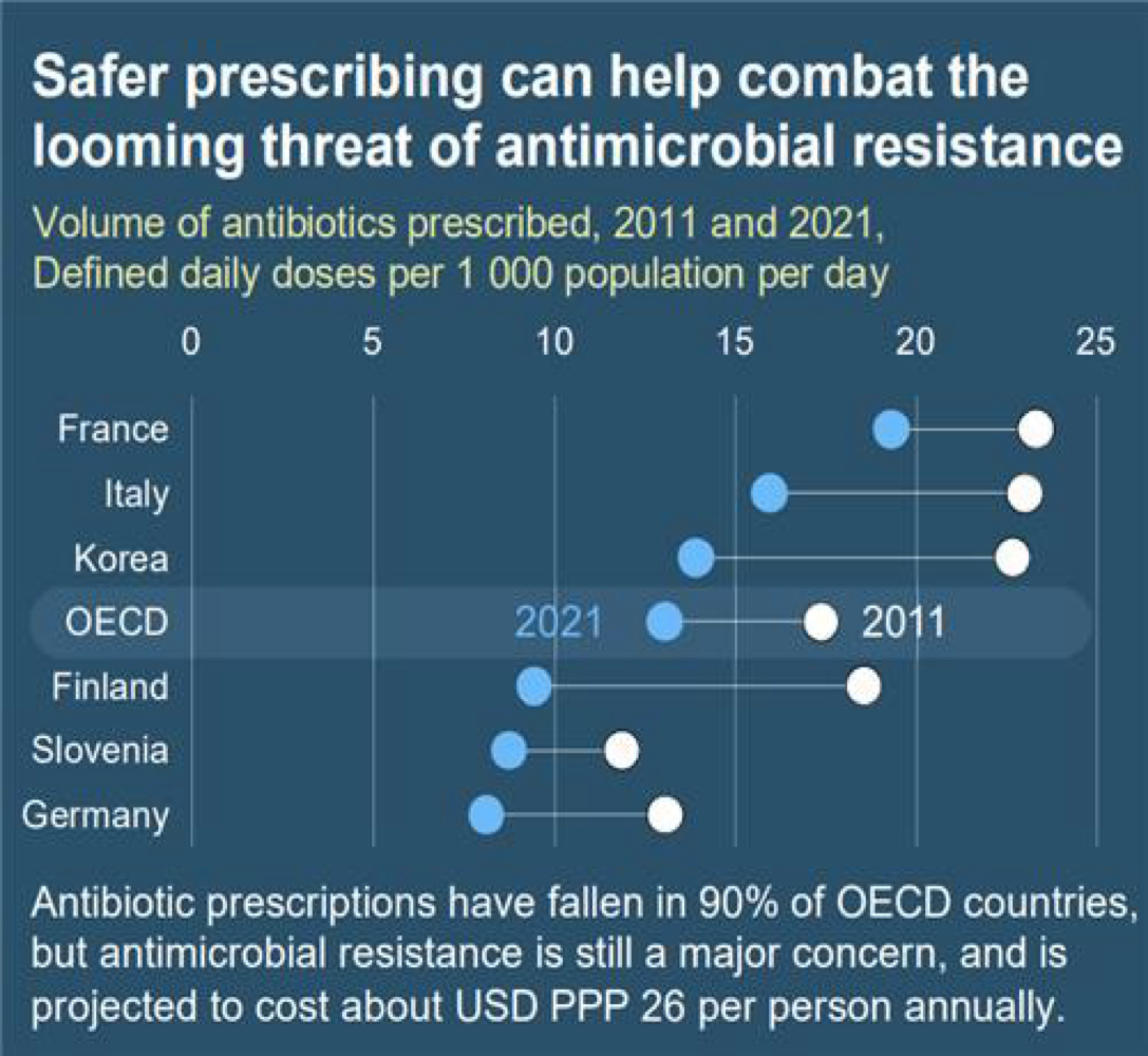 2023년 11월14일 OECD가 발간한 "health at a glance 2023"에 따르면, 2021년 한국의 항생제 사용량은 인구 1천 명당 16.0 DDD(defined daily dose, 의약품 규정 1일 사용량)으로 OECD 38개국 평균(13.1)보다 2.9 많았습니다. 즉, OECD 평균 하루 항생제 태블릿을 13개 사용하는 것과 비교하였을 때, 국내에서 하루 항생제 태블릿을 16개 정도 사용하는 수준입니다. 이는 10년 동안 34.2% 줄어든 결과이지만, 여전히 OECD 대부분 국가보다는 사용량이 많은 편임을 시사합니다.
