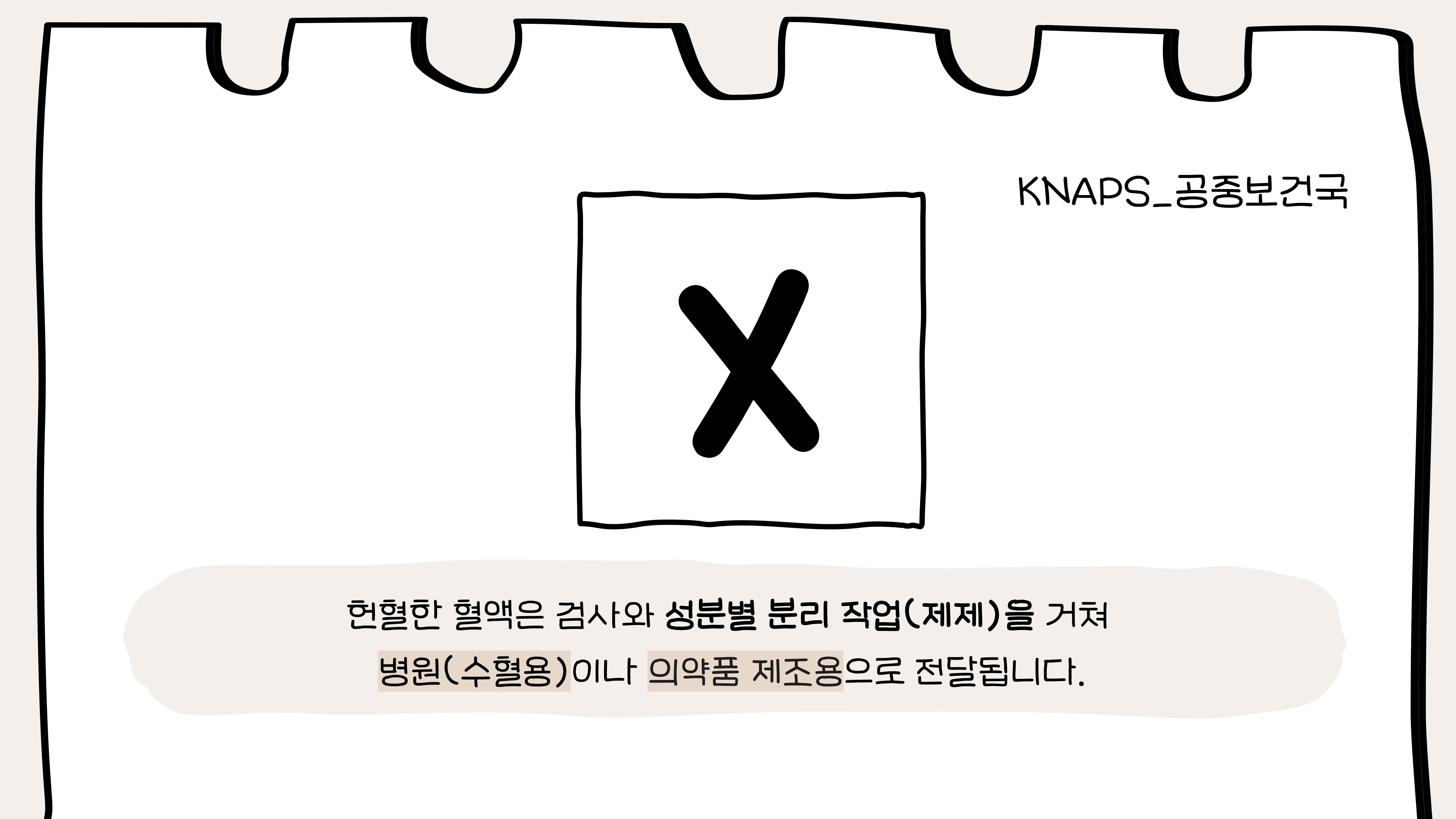 한 명의 헌혈자로부터 채혈된 전혈은 적혈구, 혈소판, 혈장 등 혈액 성분별로 분리 제조되어 병원(수혈용)이나 의약품 제조용으로 전달됩니다.