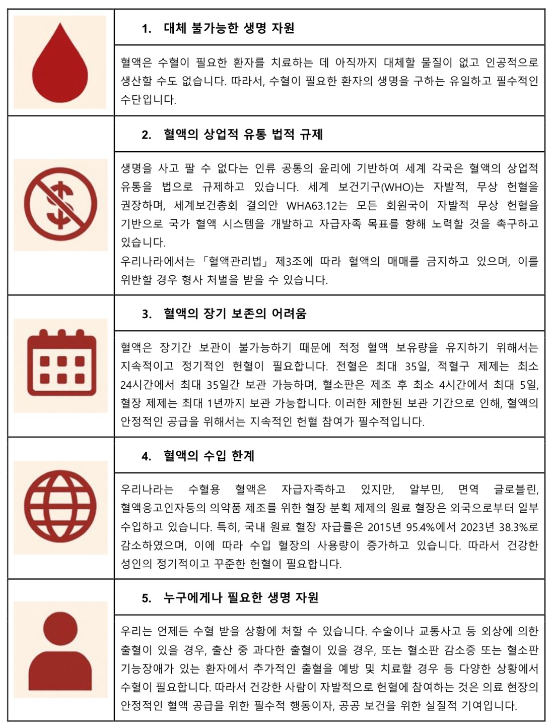 - 대한산업보건협회 한마음혈액원>알아보자>헌혈 알쓸신잡>헌혈이 왜 필요하죠?